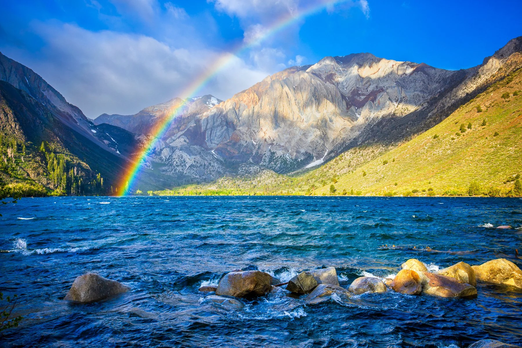 A brilliant rainbow arcs over Convict Lake as sunlight breaks through the storm, casting a glow on the rugged peaks. The deep blue waters ripple in the wind, reflecting the drama of the passing weather. Blake captures this fleeting moment of light and color, where the elements come together in perfect harmony.