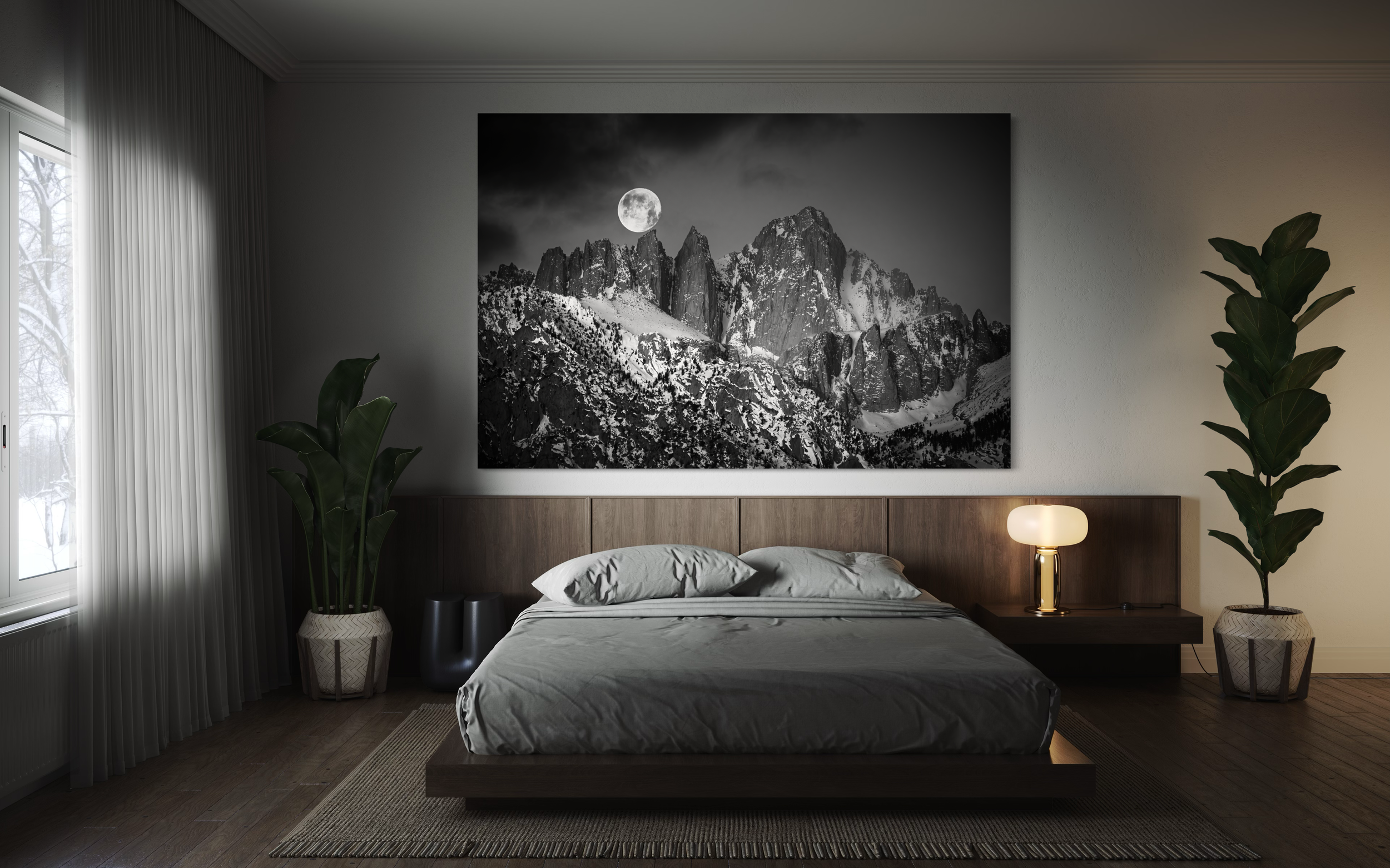 The full moon sinks behind the jagged peaks of Mount Whitney at sunrise, as soft morning light reveals the snow-dusted slopes. The black-and-white composition enhances the dramatic contrast between light and shadow, highlighting the rugged grandeur of the Sierra’s highest peak. Blake captures a fleeting moment of lunar perfection, where the moon and mountains align in quiet harmony.
